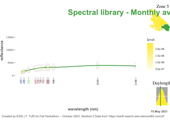 label="Created by ESIIL (T. Tuff) for Fall Hackathon -- October 2023. Sentinel 2 Data from 'https://earth-search.aws.element84.com/v0'"), color=our_grey, hjust = 0, cex=3) +