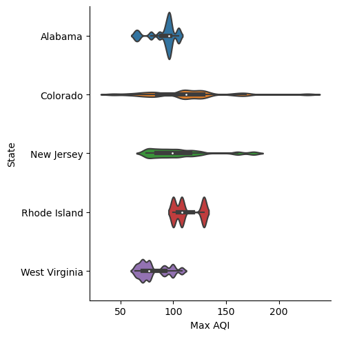 sns.catplot(data=aqi_5_states, x='Max AQI', y='State', kind='violin', bw=.15)