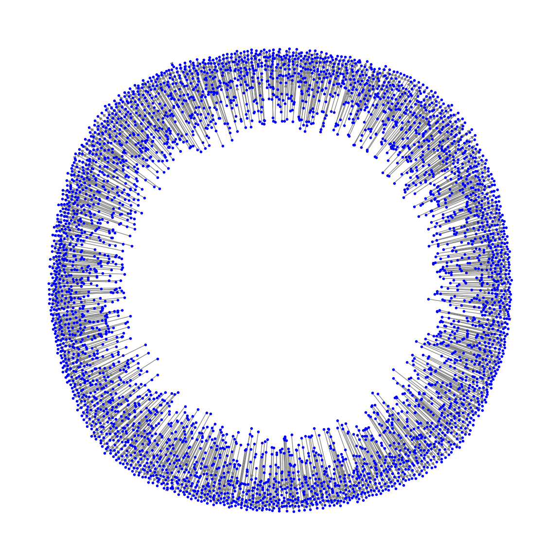nx.draw(G, pos, node_size=10, node_color="blue", edge_color="gray", with_labels=False)